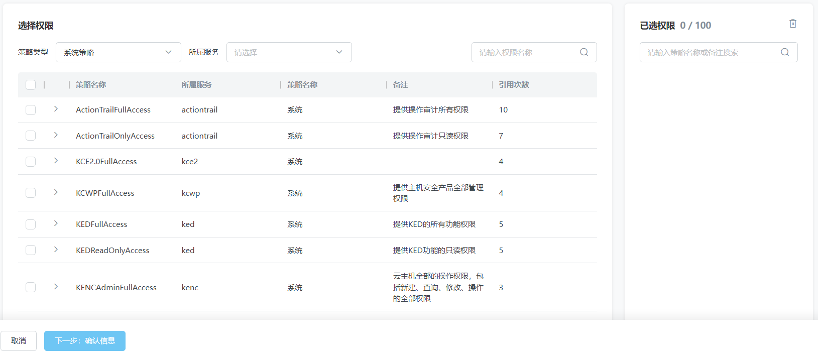 选择云服务后,可以查看云服务预定义的角色名称、备注和权限策略。单击查看策略详情查看权限策略的详情。