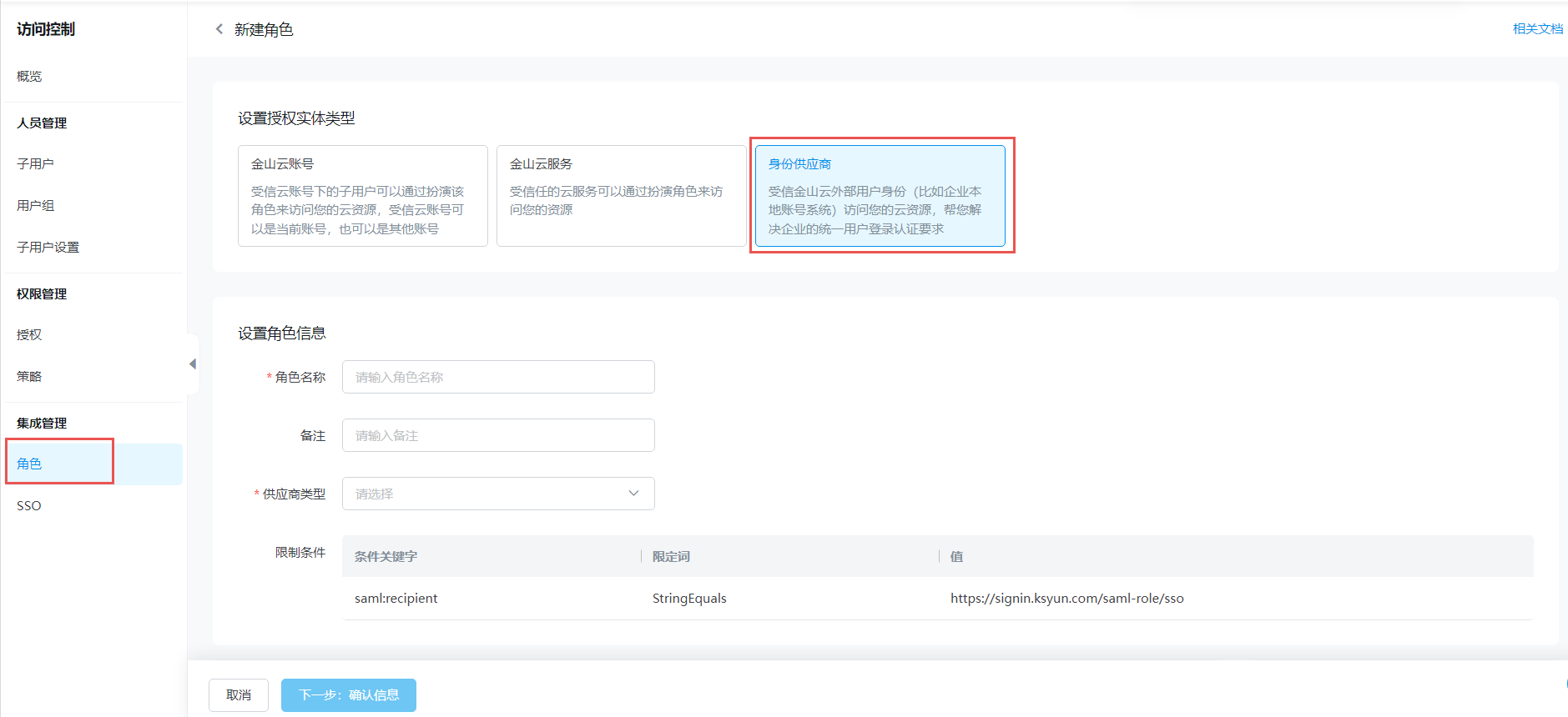 本文介绍如何创建授信实体为身份提供商的角色。该角色主要用于实现与金山云的角色SSO。