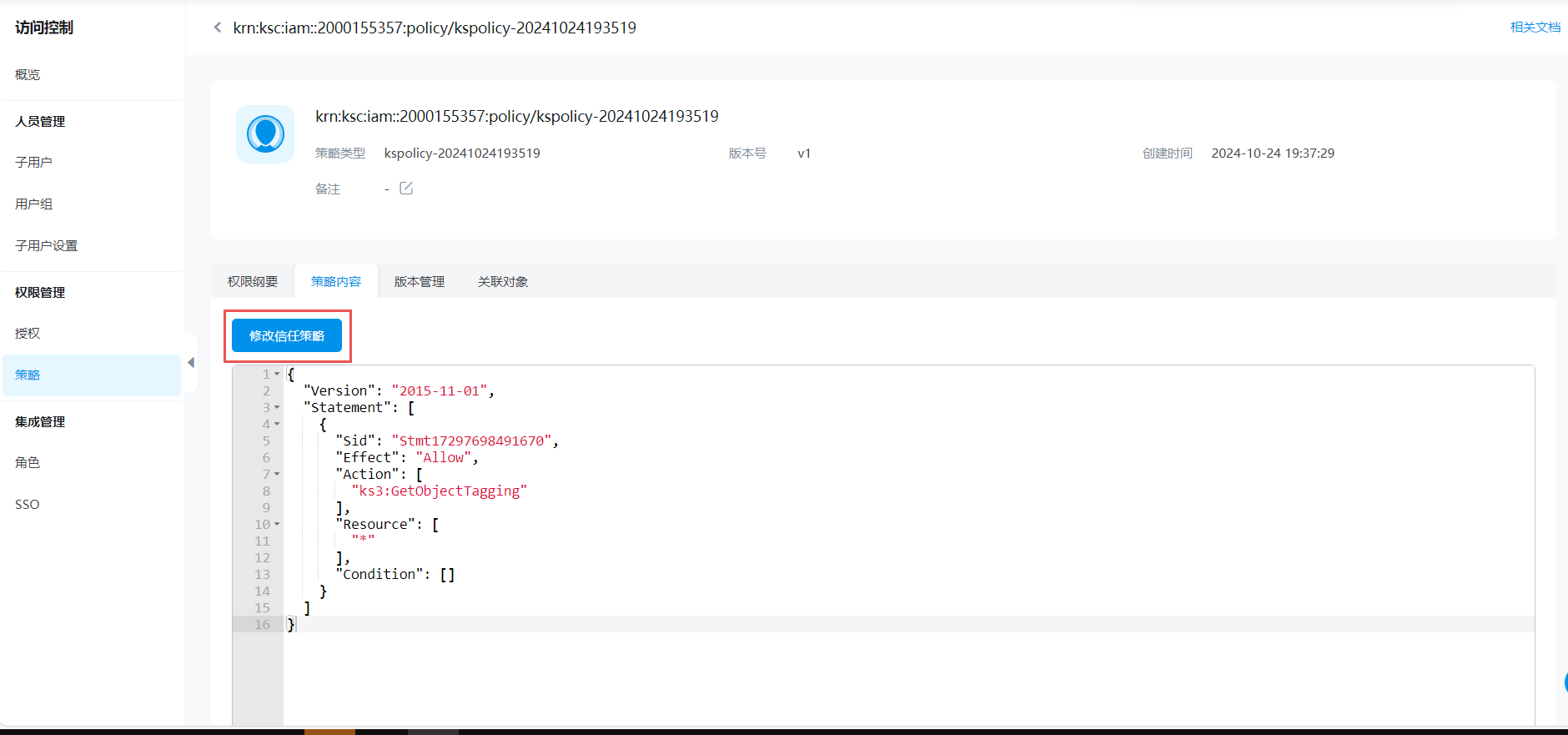 修改策略内容面板,修改权限策略内容,然后单击保存。