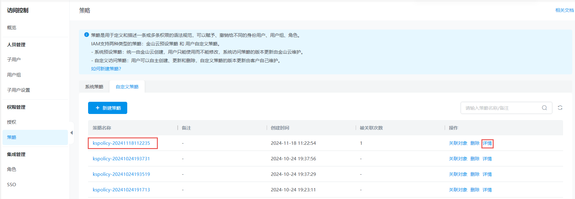 在自定义策略列表页面,单击目标策略名称或操作页详情。