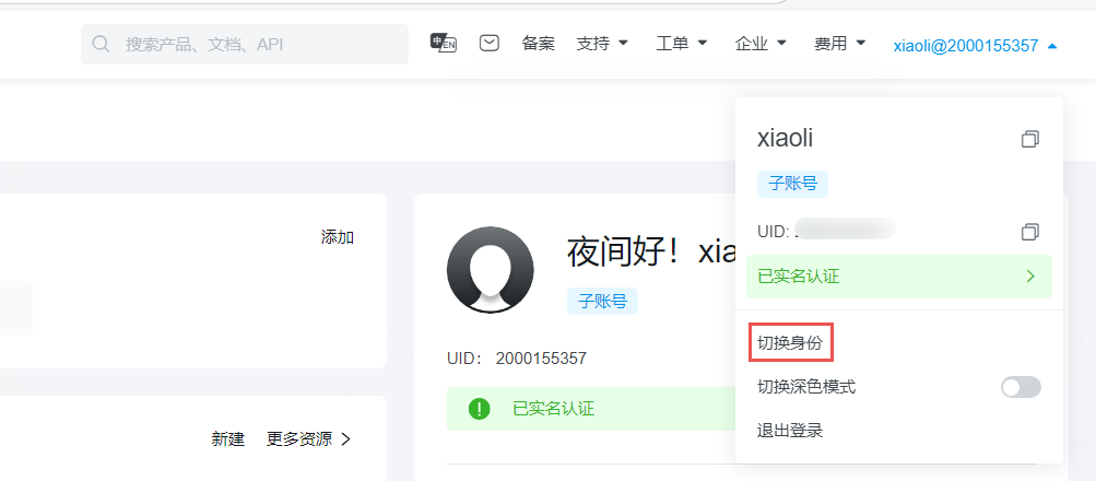 切换成功后,子用户将以角色身份登录控制台,此时子用户只能执行该角色身份被授权的所有操作。