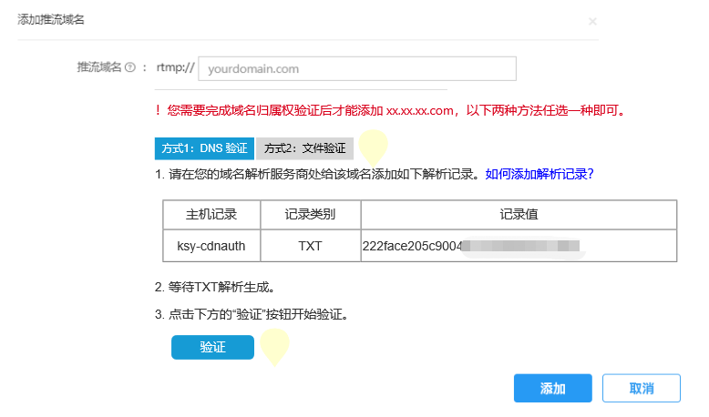 当您添加一个新的一级域名(如a.com)时,需要先完成域名归属认领。云直播提供DNS解析验证、文件验证两种方法,您可以任选其一。本文以添加a.com为例,为您介绍域名归属认领的操作方法。
