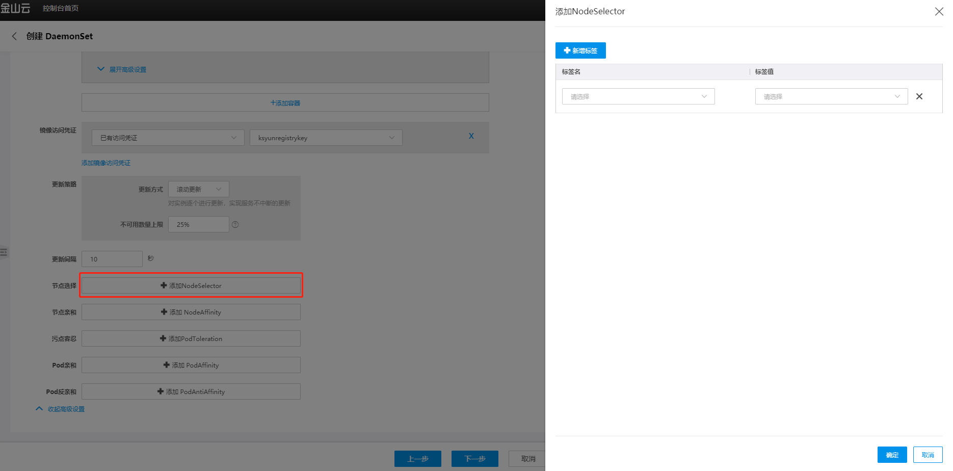- 点击高级配置,选择添加NodeSelector。