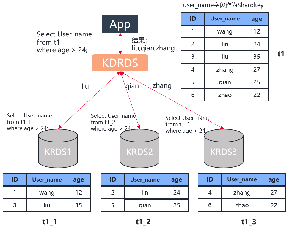 在分库分表模式下,通过代理实现数据库表的水平拆分和分布式查询,如下图所示。