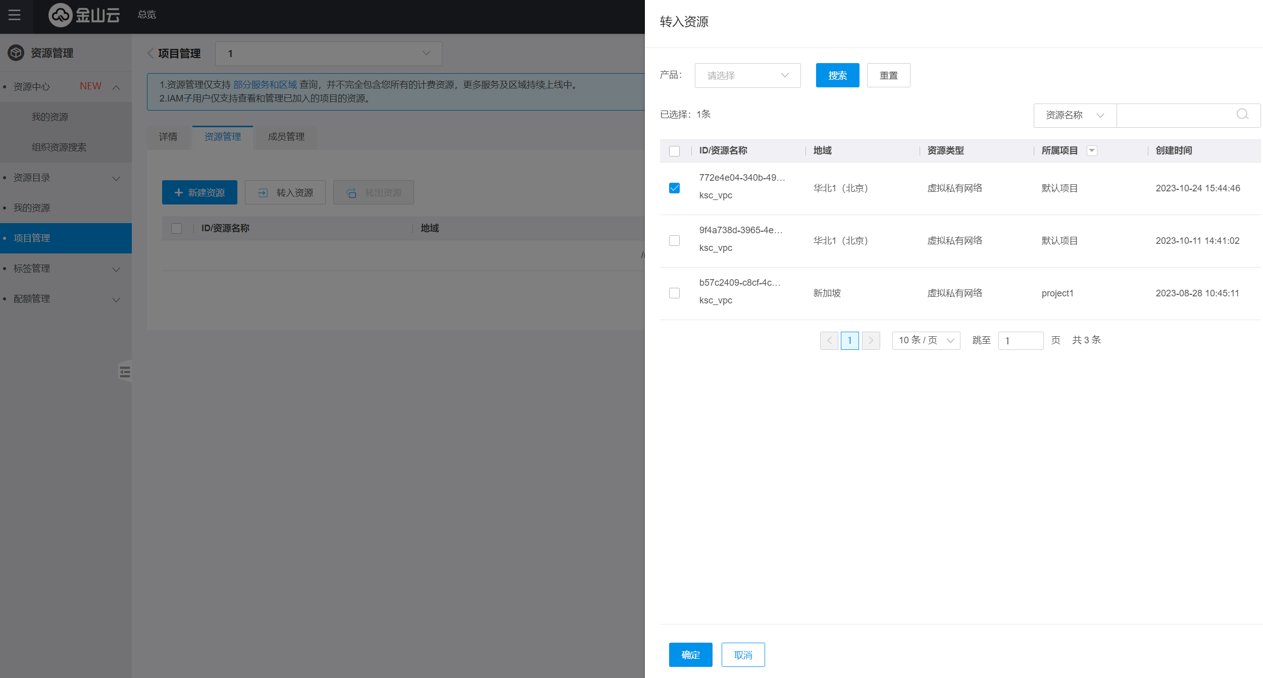 - 在转出资源面板中选择要转出至的项目(只能选择有管理权限的项目)。