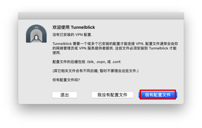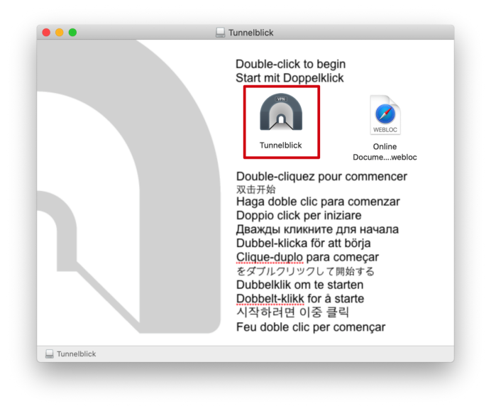 3.下载完成后,找到客户端文件,双击打开。弹出安装流程,双击Tunnelblick