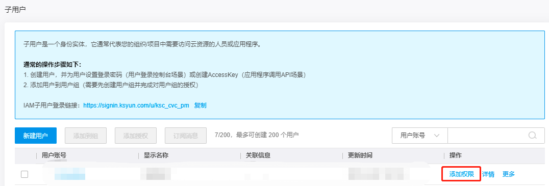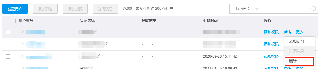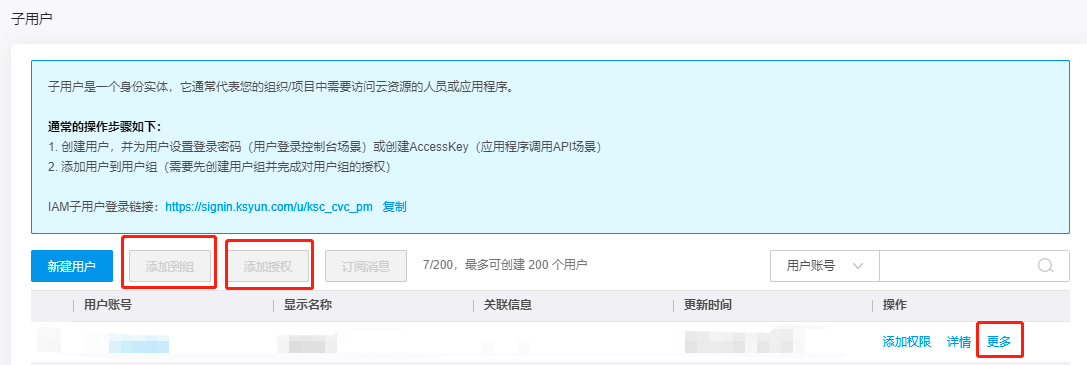 在子用户页面,可以看到所有的子账号用户列表,可进行将子账号添加到组、授权以及点击更多删除子账号操作。
