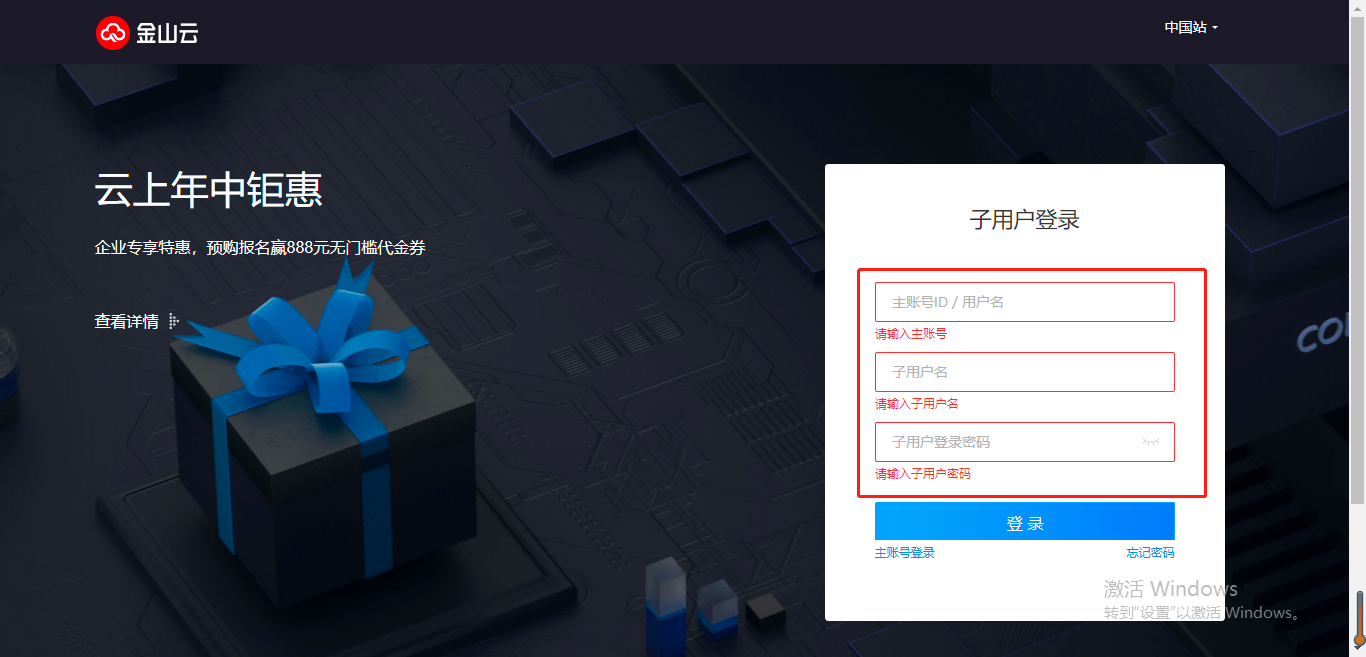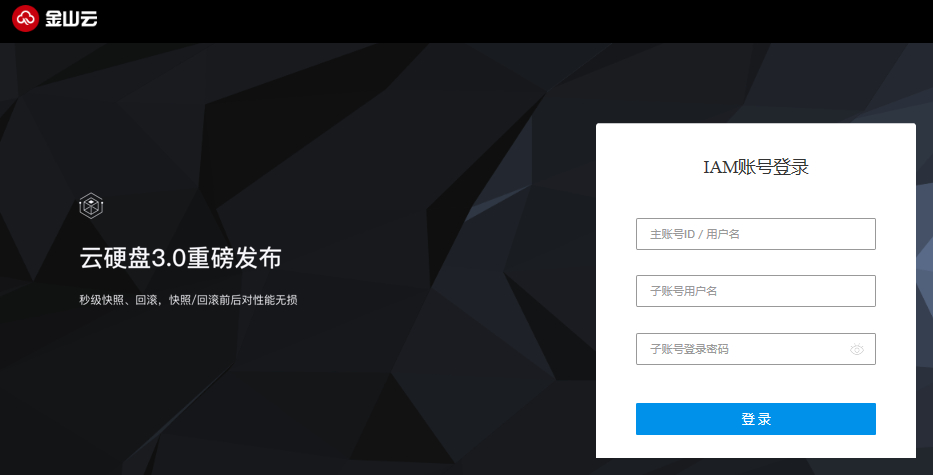 在新页面打开链接,输入主账号ID/用户名、子用户名和子账号密码即可登录