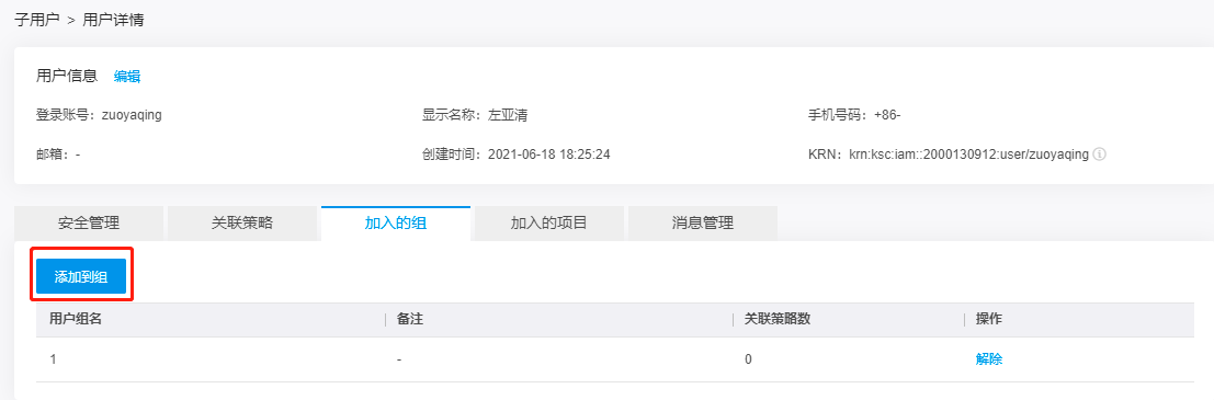 • 解除:对已经加入群组的用户,点击解除即可将用户从当前群组中移除。