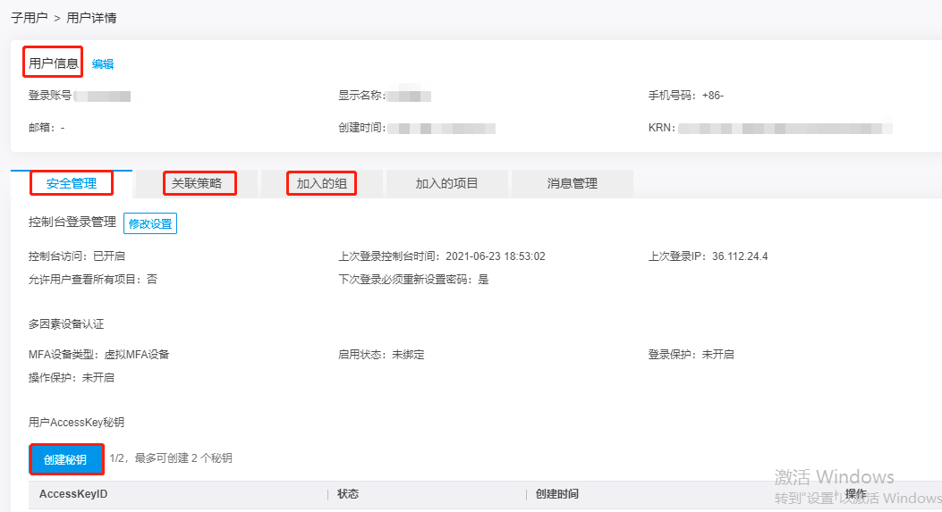 点击用户名称即可进入用户详情页面,该页面展示用户的详细信息,可编辑用户基本信息,设置控制台登录、多因素设备认证、AK密匙设置、关联策略、加入的组。