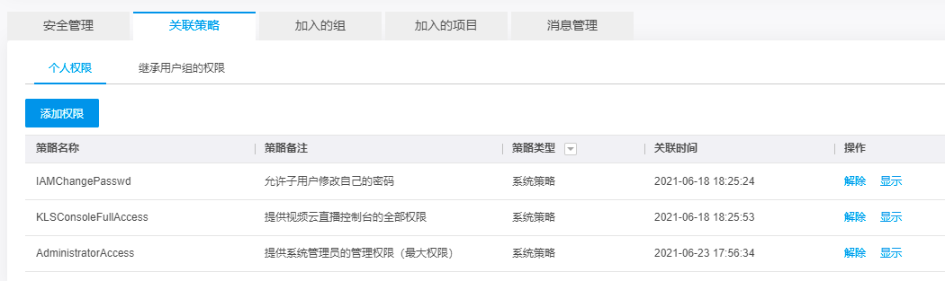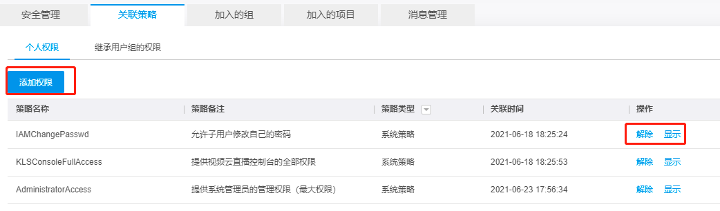 • 关联策略:点击【添加权限】即可选择策略将策略添加到当前用户;