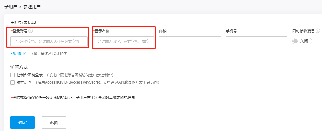 其中登录账号、显示名称必填项,一旦创建不可修改,邮箱、手机非必填项,手机邮箱经过验证后可用于接收消息。