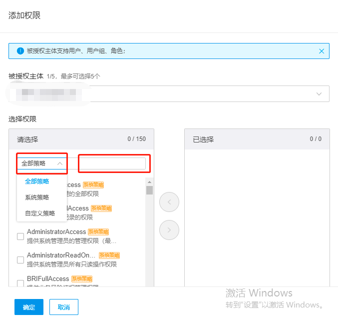 支持策略搜索及类型过滤,支持模糊搜索,策略类型包括系统及自定义策略。