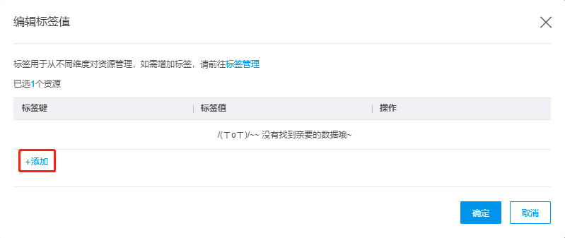 1. 若您需要添加标签,在编辑标签值页面,点击添加,选择标签键以及标签值,点击确定,即可添加成功。
