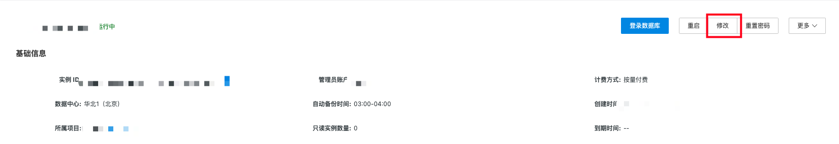点击实例名称进入详情页,点击修改按钮,可进行实例配置的修改,包括实例名称、参数组、自动备份时间及管理员密码。