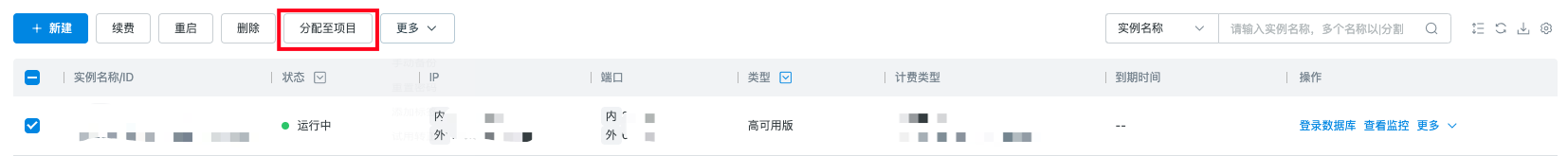 选中实例后,点击分配至项目按钮,弹出分配至项目窗口,选中想分配的项目后点击确定。