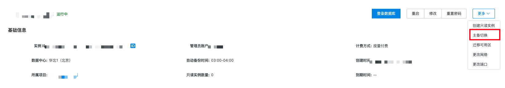点击实例名称进入详情页,点击更多处的主备切换,弹出实例主备可用区切换窗口。