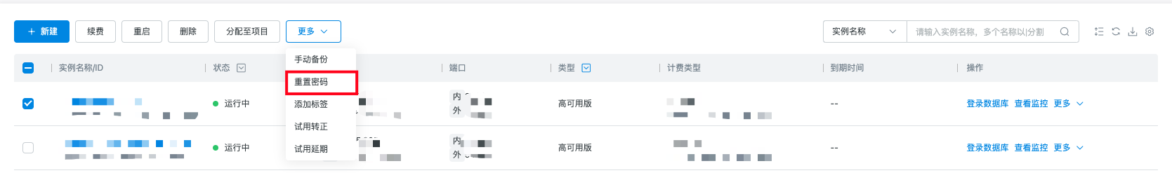选中实例后,点击重置密码按钮,弹出重置密码窗口,输入新密码后点击确认后可进行实例的密码重置。