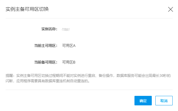 显示当前主可用区和备可用区,点击确定,即可切换主备可用区。