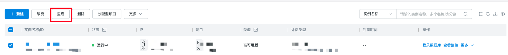 选中实例后,点击重启按钮,弹出提醒窗口,点击重启可进行实例的重启。