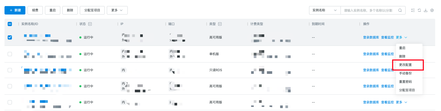 选择目标实例,在更多处点击更改配置,弹出更配窗口,变更配置后点击确认后可进行实例的变更。