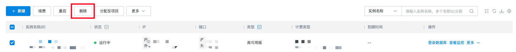 选中实例后,点击删除按钮可进行实例的删除。支持删除的实例包括高可用实例和只读实例。当删除实例类型为高可用时,关联的只读实例、临时实例也一并删除。