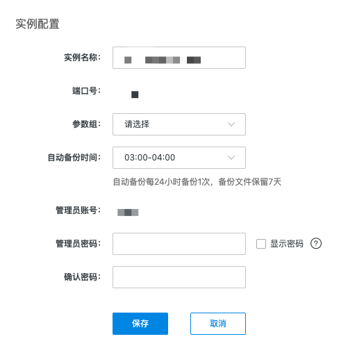 点击实例名称进入详情页,点击修改按钮,可进行实例配置的修改,包括实例名称、参数组、自动备份时间及管理员密码。