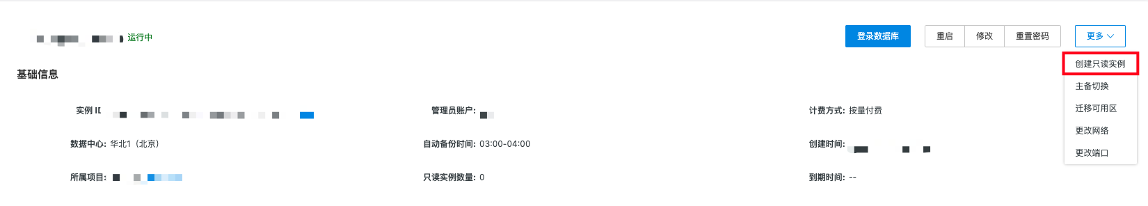 点击实例名称进入详情页,点击更多处的创建只读实例按钮,跳转到创建只读实例页面,选择需要创建只读实例的配置等相关信息后,点击购买即可。
