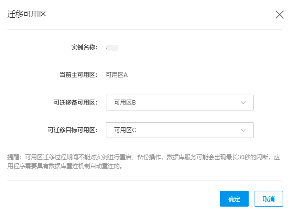 可用区迁移过程期间不能对实例进行重启、备份操作,数据库服务会出现最长30秒的闪断,应用程序需要具有数据库重连机制自动重连。