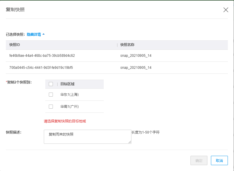 选择复制的目标地域(可多选),并填写快照描述,单击确定后即可复制