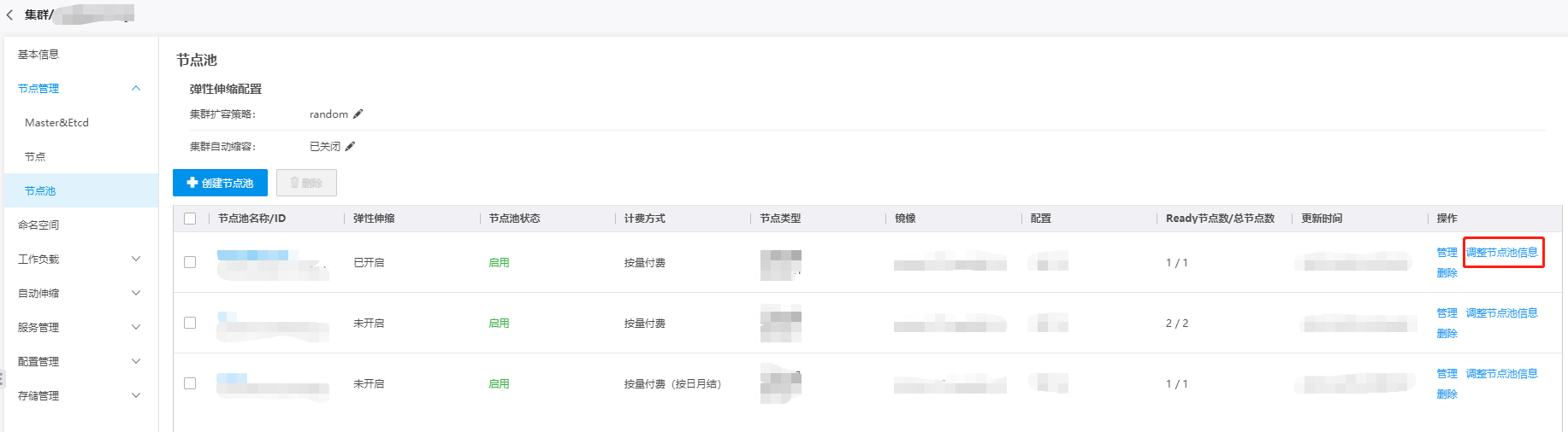 - 选择需要调整节点池信息的节点池,点击调整节点池信息,如下图所示: