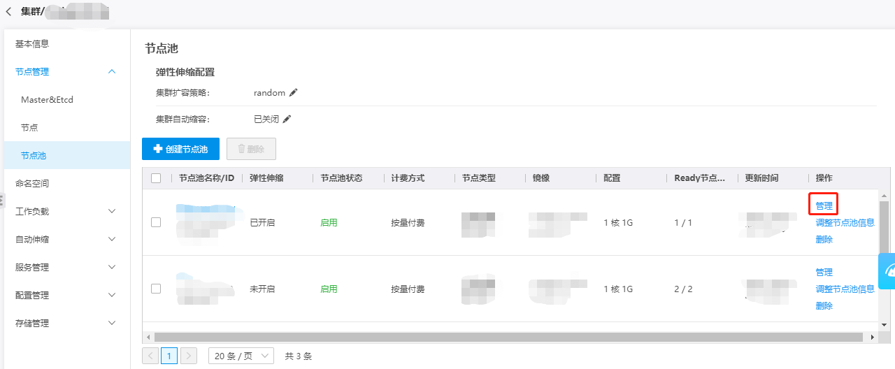 - 在节点池列表页中,选择需要整体管理的节点池,点击管理,如下图所示: