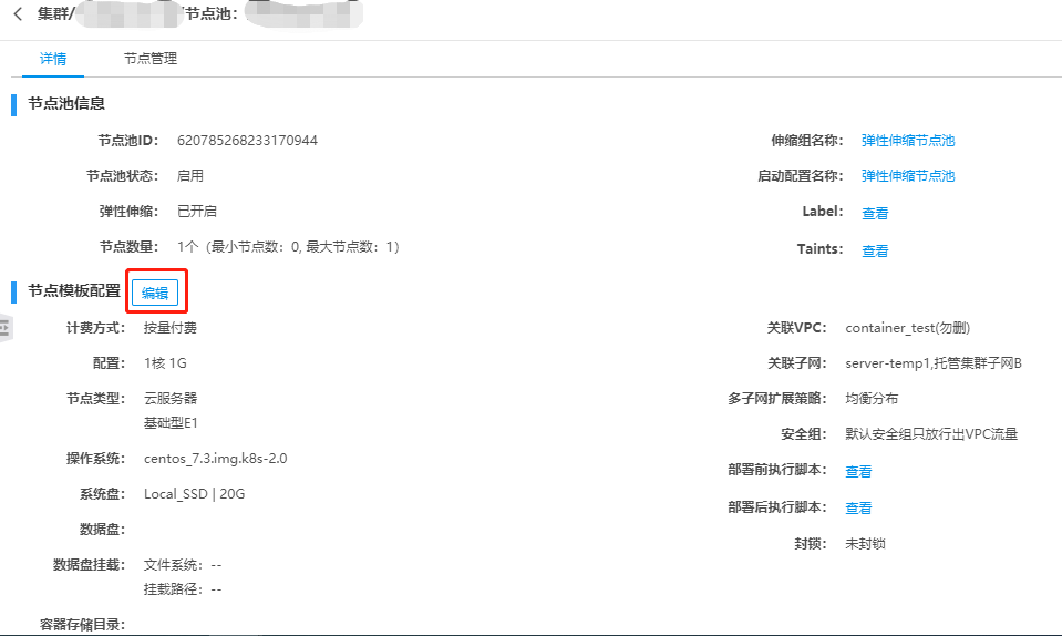 - 进入所选节点池详情页,点击编辑,即可按需对节点模板进行修改,如下图所示:
