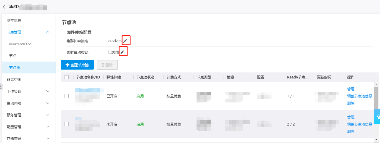在节点池列表页中,点击集群扩容策略或集群自动缩容的修改图标,如下图所示: