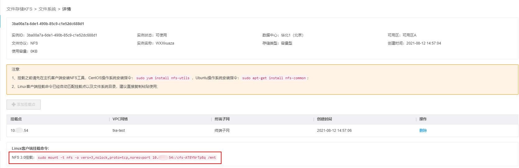 mkdir /mnt目前只支持NFS v3.0,使用以下命令挂载(以下命令可以在文件系统详情中查看)。