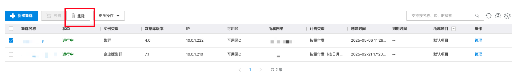选中实例后,点击实例列表上方的删除可进行实例的删除。支持批量删除。