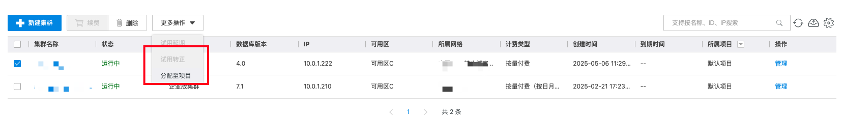 选中实例后,点击实例更多操作的分配至项目按钮,弹出分配至项目窗口,选中想分配的项目后点击确定。