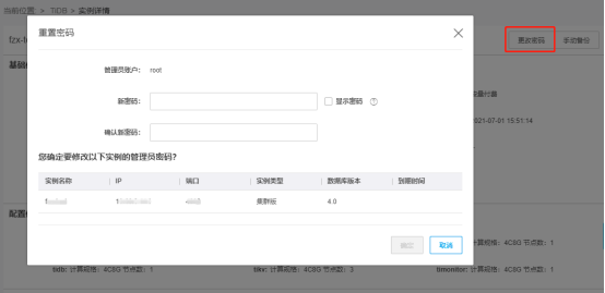在实例详情页,点击更改密码按钮,弹出重置密码窗口,输入新密码后点击确认即可进行实例的密码重置。