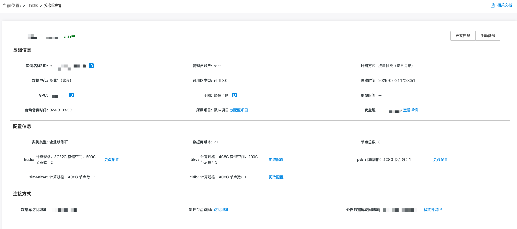 在实例详情页,点击手动备份按钮,可进行手动备份,具体操作详见备份。