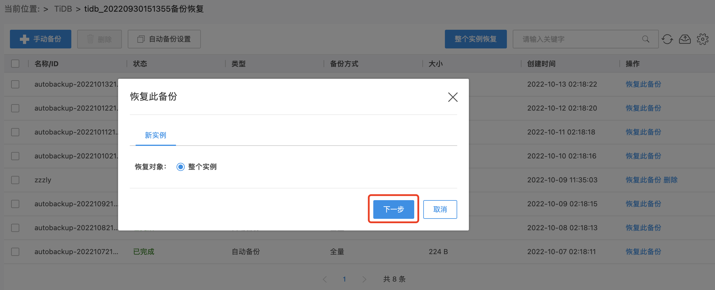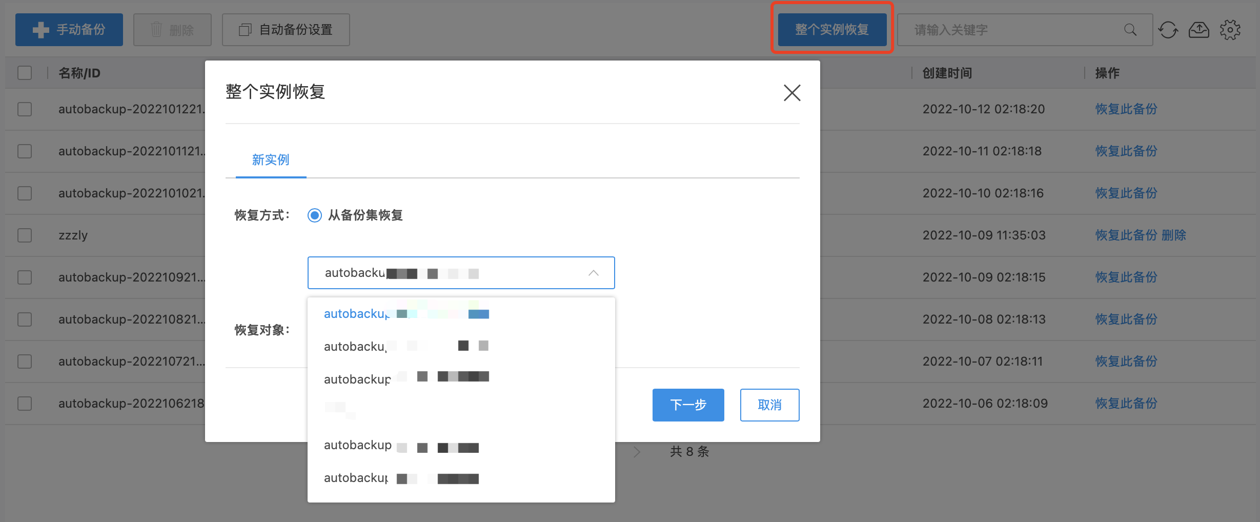 点击“整个实例恢复” ,手动下拉选择需要恢复的备份集