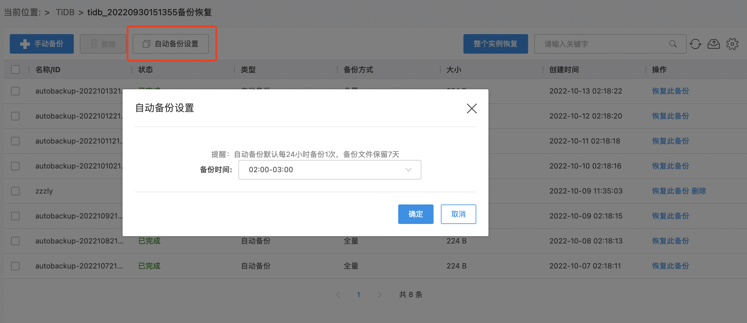 自动备份默认每24小时备份1次,可以自定义设置备份的时间,时间段时长为1小时,默认保留7天