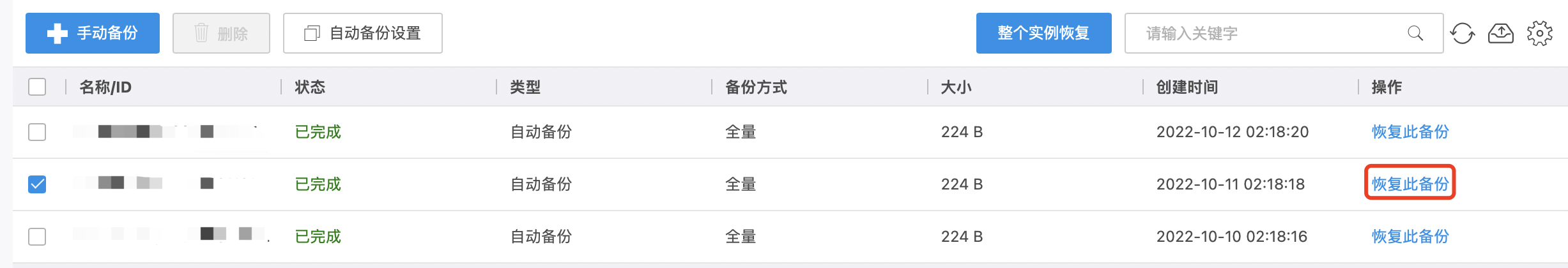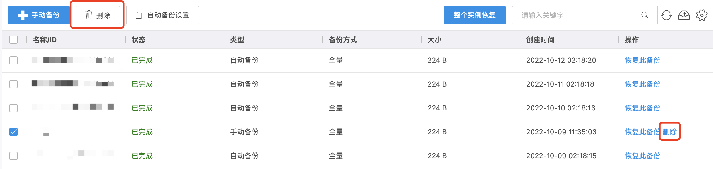 勾选备份,点击操作栏中的删除,即可删除备份,支持批量删除。(手动备份可删除 自动备份不可删除)