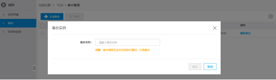 弹出备份实例窗口,输入备份名称后点击确定,可进行实例的备份(弹窗同“入口一”)