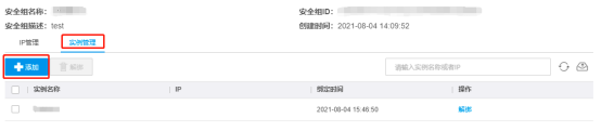 - 若您需要在此安全组中添加实例,在安全组详情页,点击实例管理,点击添加。
