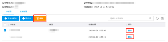 您可以在此安全组中删除某些IP,在安全组IP管理分页,勾选IP,点击删除即可。
