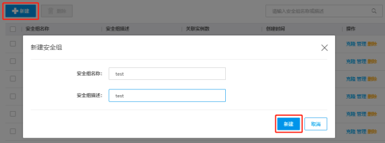 - 填写安全组名称及描述后,点击新建,安全组新建成功。
