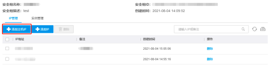 默认进入安全组管理页 > IP管理分页。若想要添加此账号下已开通的主机IP,点击添加主机IP。