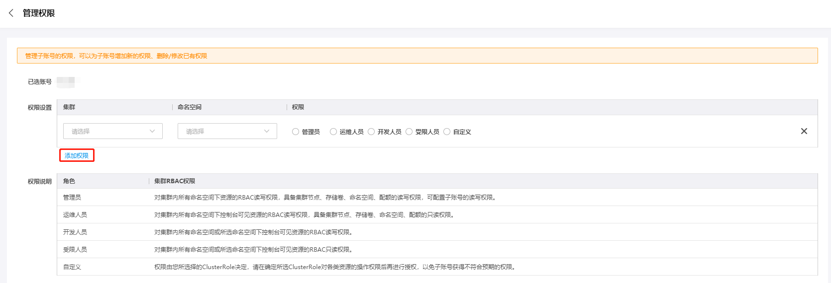 | 自定义 | 权限由您所选择的ClusterRole决定,请在确定所选ClusterRole对各类资源的操作权限后再进行授权,以免子账号获得不符合预期的权限。 |