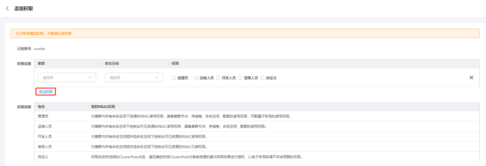 | 受限人员(kce:ns:restricted) | 对所选命名空间下控制台可见资源的RBAC只读权限, 需要选择指定命名空间。 |