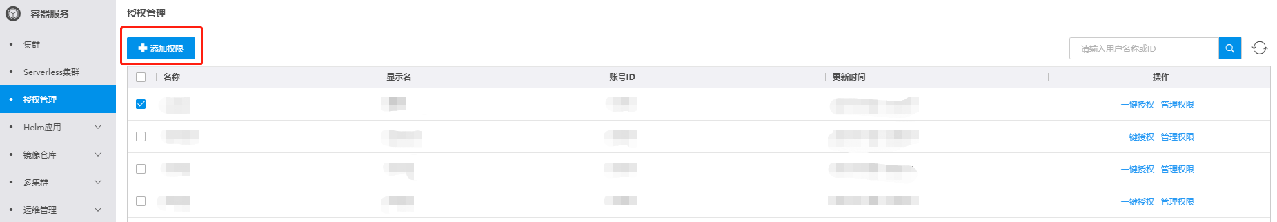 主账号可以在所有集群维度进行一键授权。